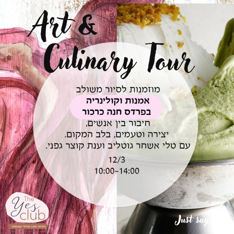 סיור משולב אמנות וקולינריה בפרדס חנה 12/3 יום של טעמים, יצירה והשראה – בהנחיית ענת קוצר גפני וטלי אשחר גוטליב מוזמנות להצטרף לחוויה חד-פעמית שמכניסה אתכם אל הלב הפועם של פרדס חנה – בירת היצירה,