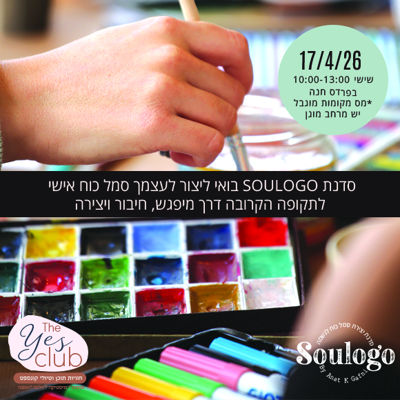 סדנת soulogo בפרדס חנה 17/4 סדנת soulogo – יצירת לוגו לנשמה לחיזוק עמוד השידרה בימים סוערים. זהו תהליך יצירתי ומונחה ליצירת סמל כוח אישי סמל שמזקק מה אנחנו מבקשות לחזק עכשיו (דוקא בימים כל