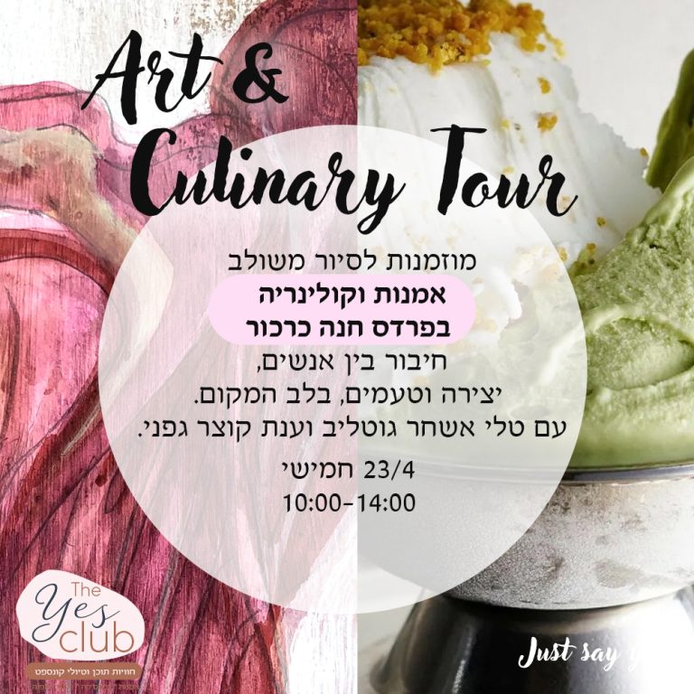סיור משולב אמנות וקולינריה בפרדס חנה 23/4 יום של טעמים, יצירה והשראה – בהנחיית ענת קוצר גפני וטלי אשחר גוטליב מוזמנות להצטרף לחוויה חד-פעמית שמכניסה אתכם אל הלב הפועם של פרדס חנה – בירת היצירה,
